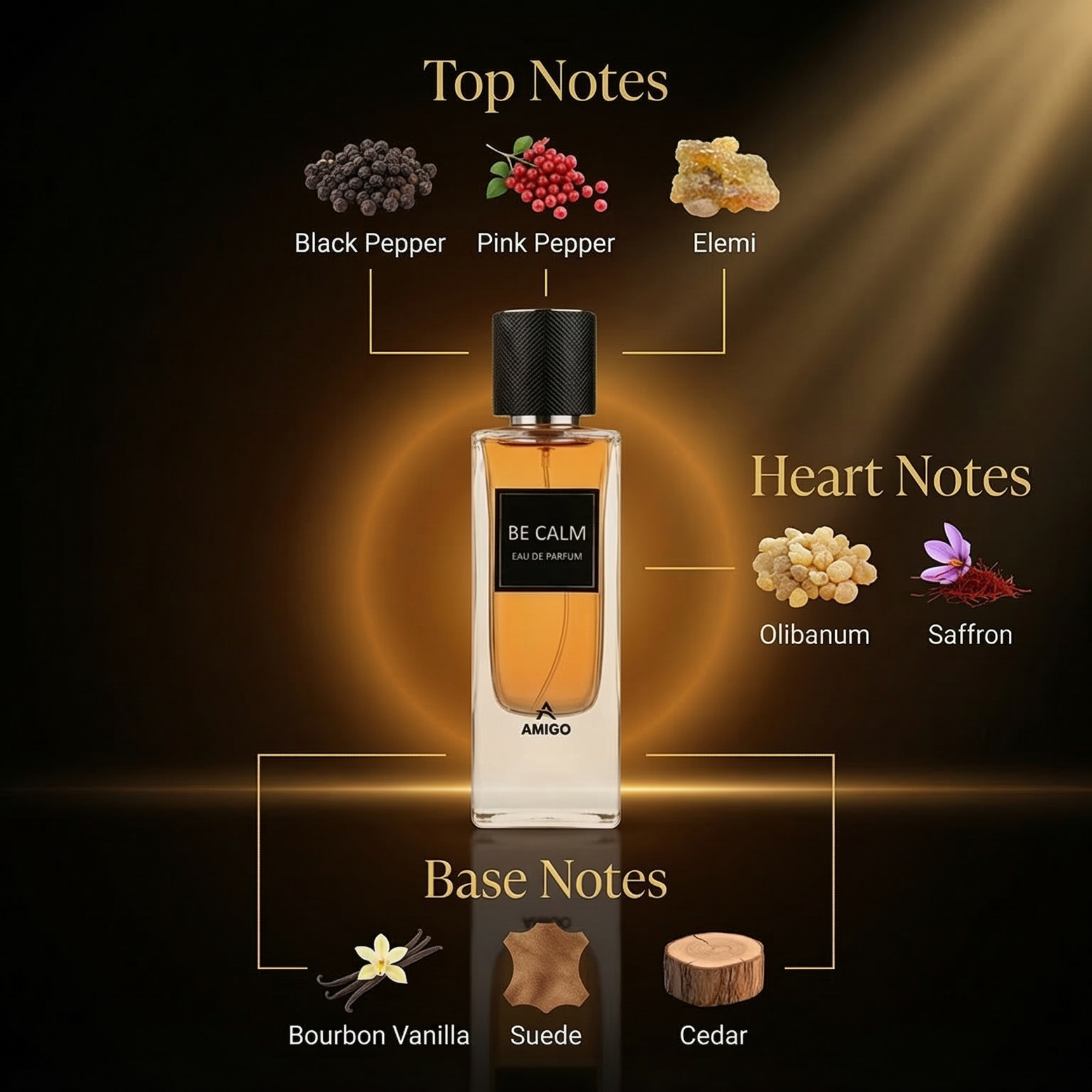 Be Calm من AMIGO هو عطر فاخر للجنسين يتميز بطابع شرقي دافئ يجمع بين التوابل الغنية والجلود الناعمة مع لمسة فانيليا أنيقة. يمنح هذا العطر حضورًا قويًا وفخمًا يعكس الشخصية الجريئة والراقية.