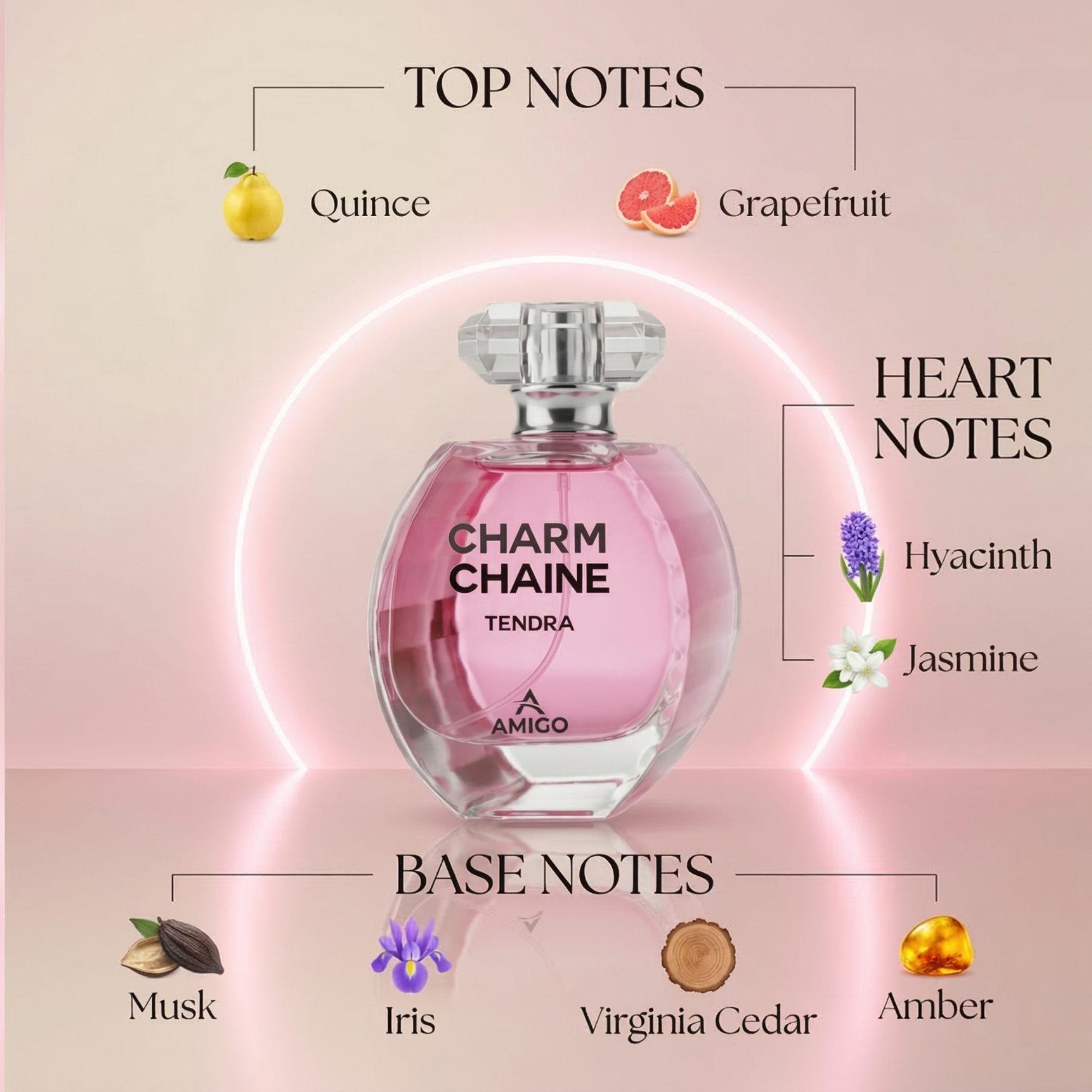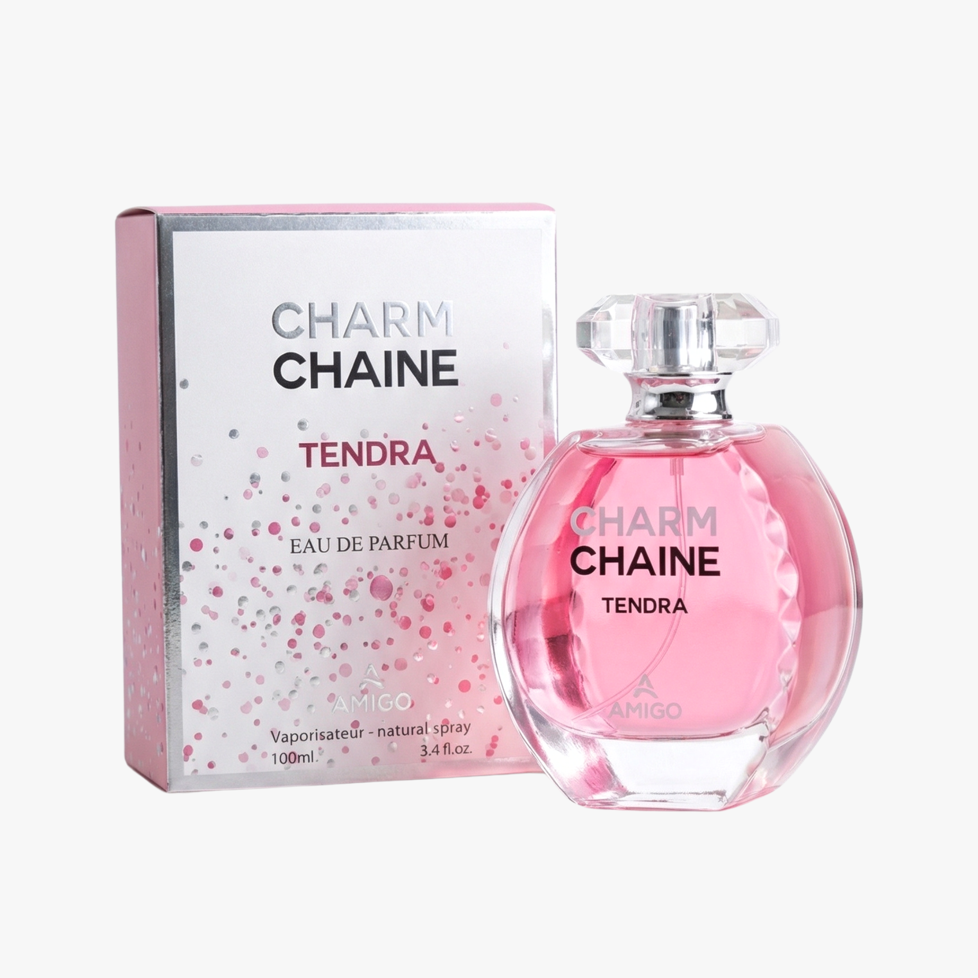 Charm Chaine Tendra من AMIGO هو عطر نسائي ناعم ومشرق يجسد الأنوثة الرقيقة والانتعاش الحيوي في تركيبة أنيقة مليئة بالحيوية. يتميز بطابع زهري فاكهي منعش يمنح إحساسًا بالبهجة والأنوثة طوال اليوم.
