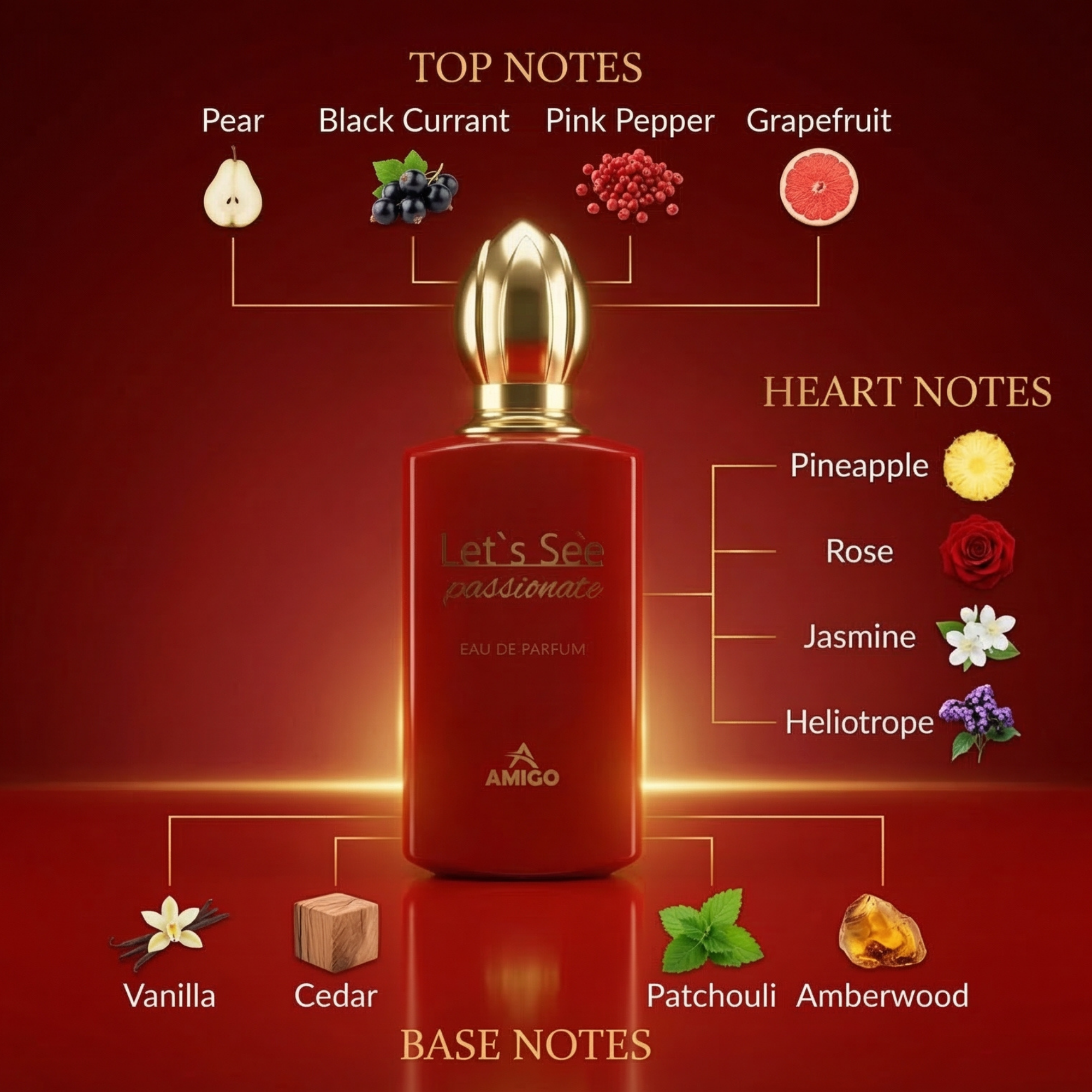 Let’s See Passionate من AMIGO هو عطر نسائي أنيق يعكس الجرأة والأنوثة في آنٍ واحد. يتميز هذا العطر بطابع زهري فاكهي دافئ يمنح المرأة حضورًا جذابًا مليئًا بالحيوية والثقة.