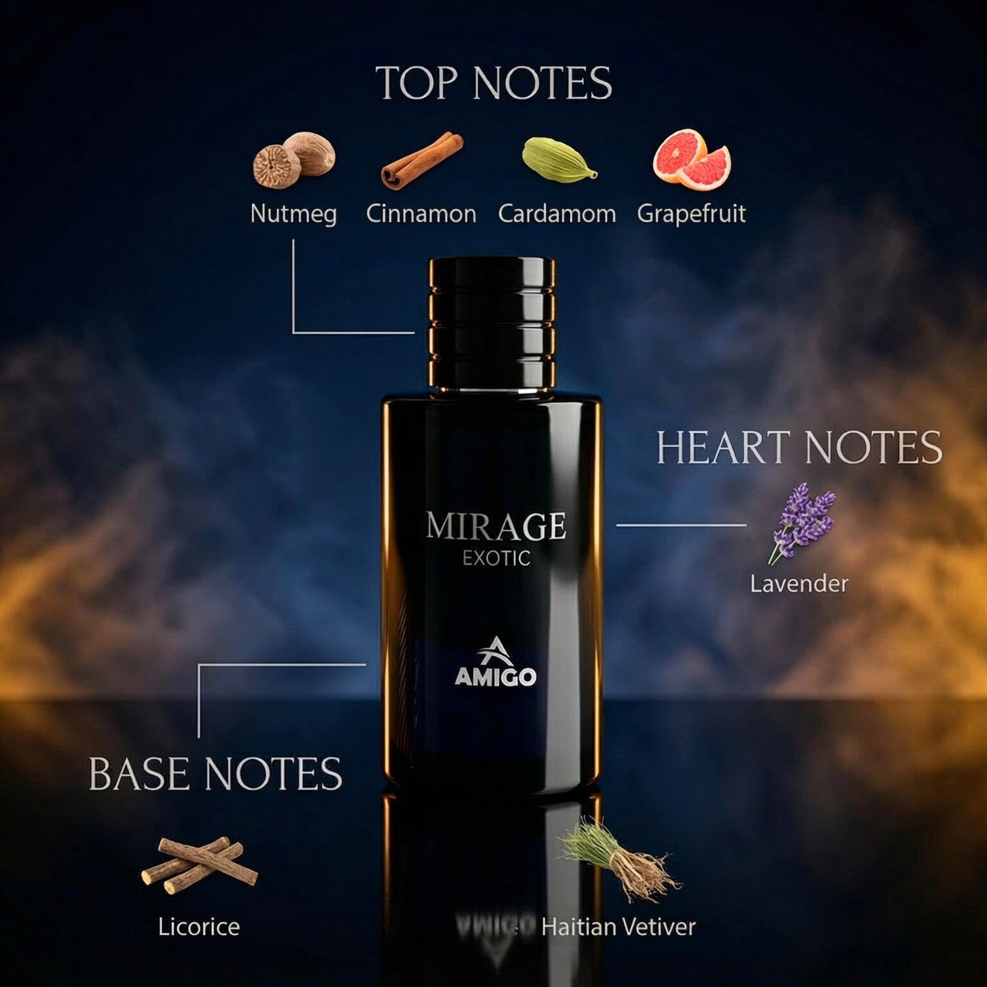 AMIGO Mirage Exotic هو عطر رجالي قوي وعميق يجمع بين التوابل الدافئة والنفحات العطرية الراقية في تركيبة جريئة تعكس شخصية الرجل الواثق. رائحة فاخرة وقوية تمنحك حضورًا مميزًا يدوم طويلًا وتترك أثرًا لا يُنسى.