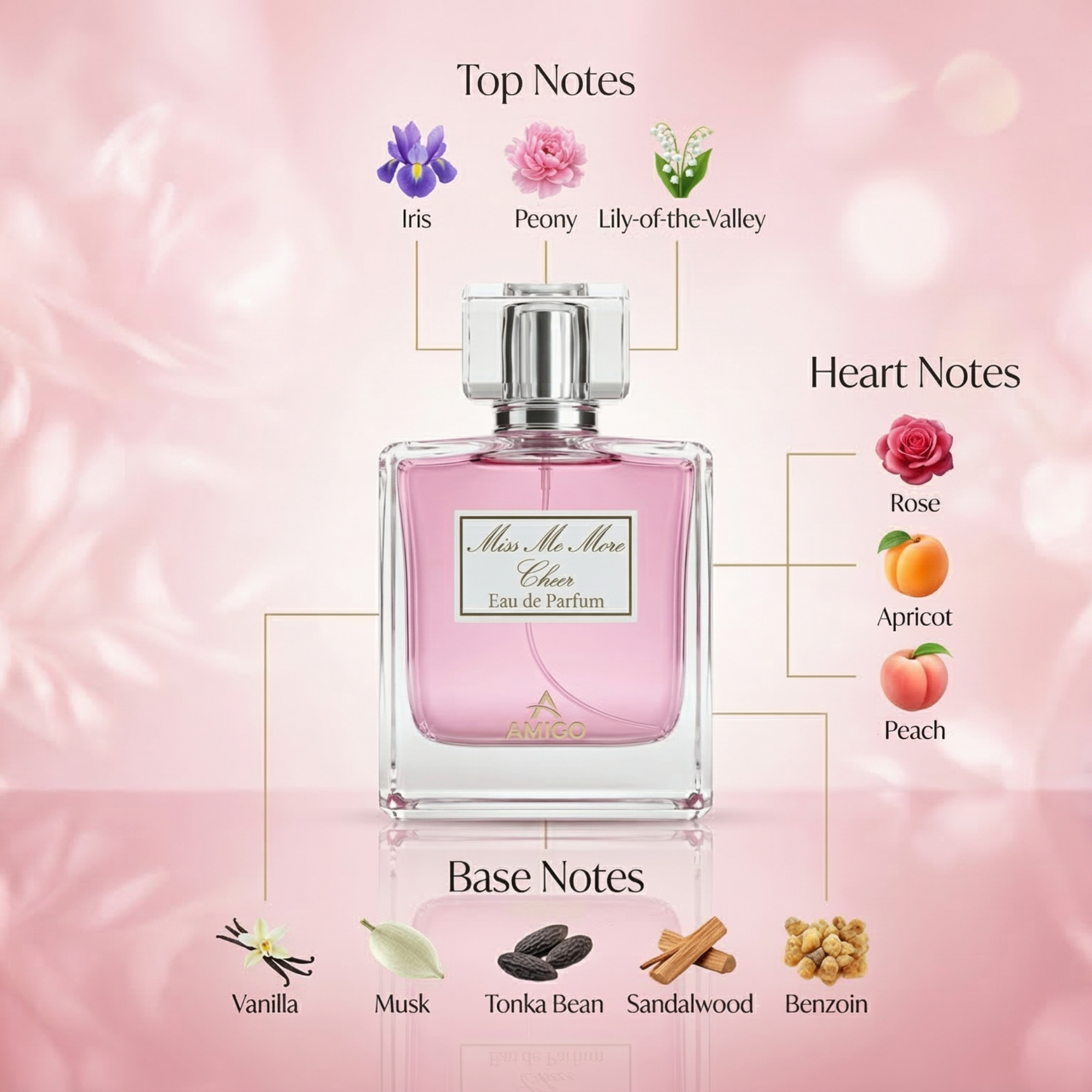 Miss Me More Cheer من AMIGO هو عطر نسائي أنيق يجسد الرومانسية والأنوثة في تركيبة زهرية فاكهية ناعمة. صُمم هذا العطر ليعكس شخصية المرأة العصرية المليئة بالنعومة والجاذبية.