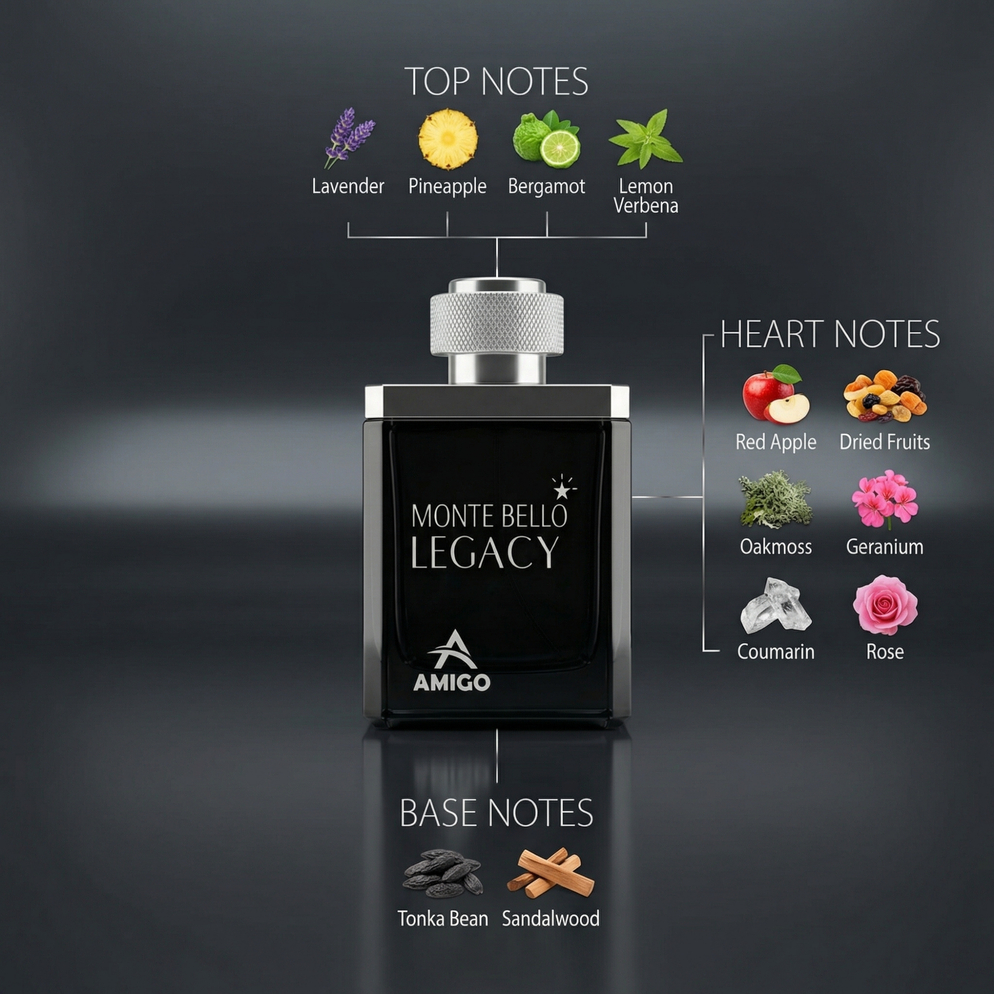 AMIGO Monte Bello Legacy هو عطر رجالي عطري منعش يجمع بين الأناقة الكلاسيكية واللمسة العصرية في تركيبة متوازنة تناسب الرجل الواثق والهادئ. رائحة نظيفة، جذابة وسهلة الارتداء تمنحك حضورًا أنيقًا يدوم طوال اليوم.