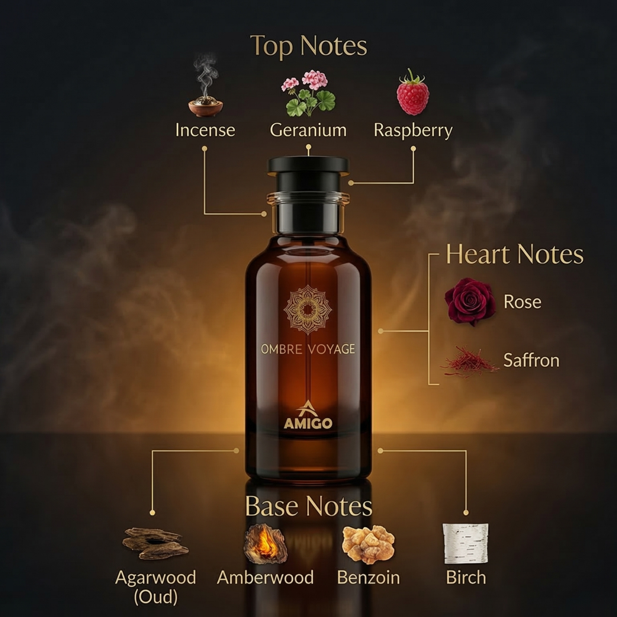 AMIGO Ombre Voyage هو عطر فاخر للجنسين مستوحى من عالم العطور الشرقية العميقة التي تجمع بين العود الفخم واللمسات الدافئة الجذابة. عطر غني يعكس الفخامة والقوة ويترك حضورًا لا يُنسى.