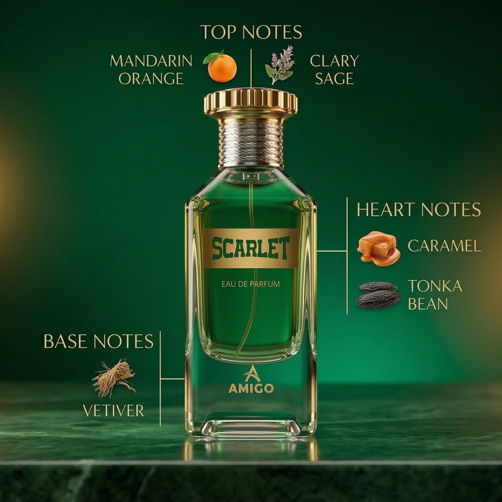 AMIGO Scarlet Pour Homme هو عطر رجالي حلو دافئ يجمع بين الحيوية العطرية واللمسة الكراميلية الجذابة في تركيبة جريئة تناسب الرجل الواثق والجريء. رائحة ملفتة، حلوة ومتوازنة تمنحك حضورًا قويًا ولا يُنسى من أول رشة وحتى نهاية السهرة.