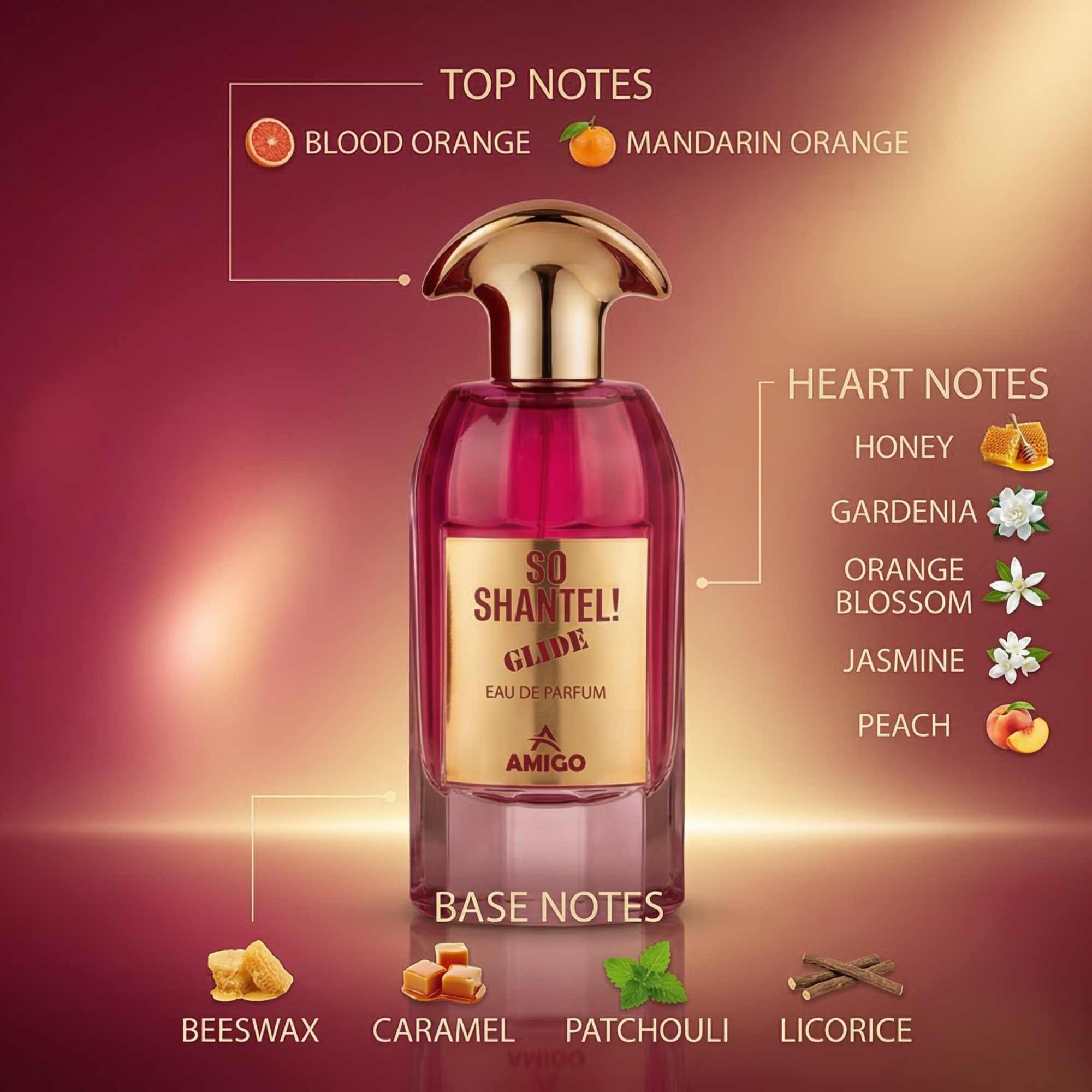 So Shantel Glide من AMIGO هو عطر نسائي جريء وأنثوي مستوحى من العطور الزهرية الحلوة التي تعكس شخصية المرأة الواثقة والمشرقة. يجمع العطر بين النعومة والجرأة ليمنح حضورًا لافتًا يدوم طوال اليوم.