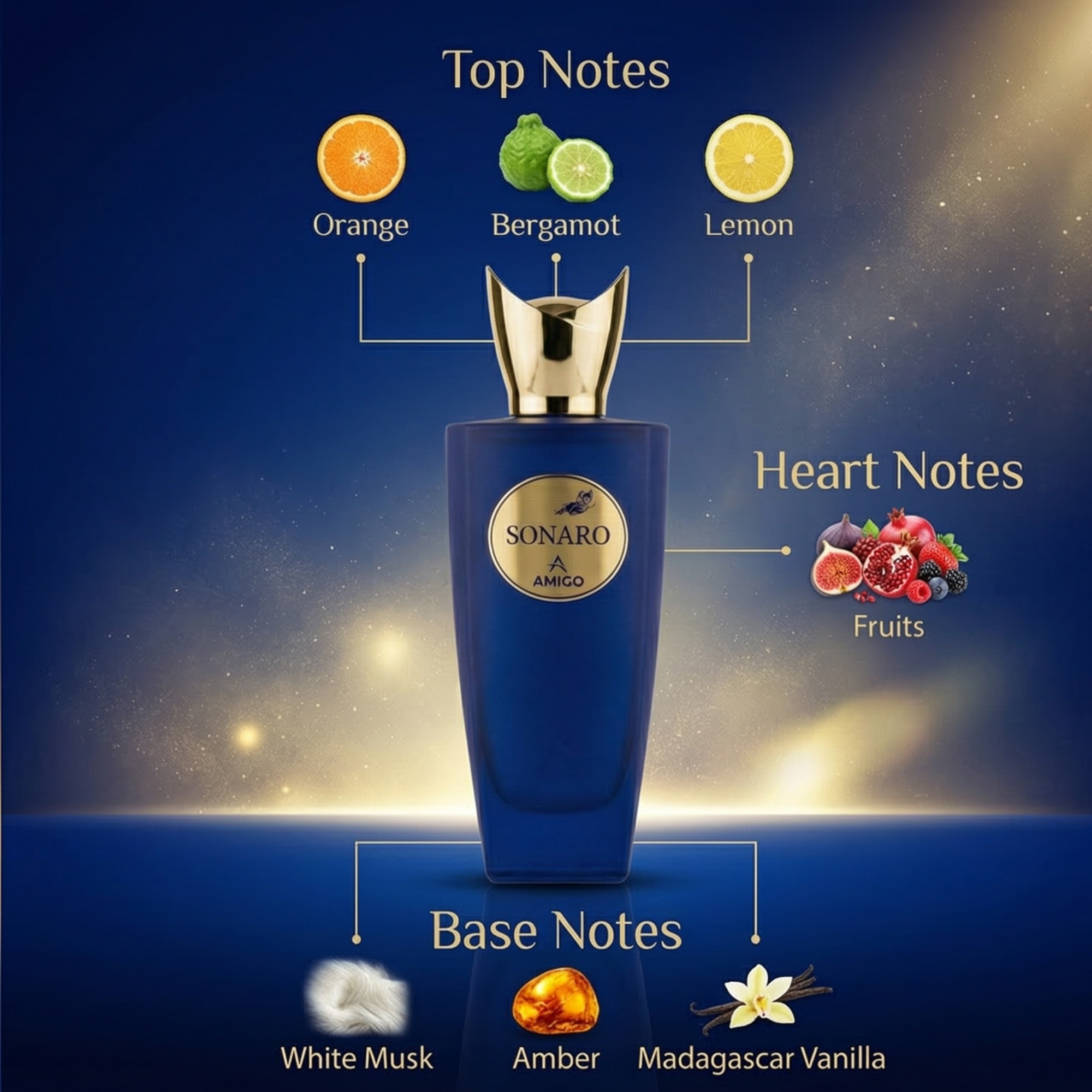 AMIGO Sonaro هو عطر فاخر للجنسين يتميز برائحة فاكهية مشرقة ممزوجة بلمسات عنبرية ومسك ناعم يمنح العطر طابعًا فاخرًا وجذابًا. تركيبة أنيقة تجمع بين الانتعاش والحلاوة لتمنحك حضورًا مميزًا يدوم طوال اليوم.