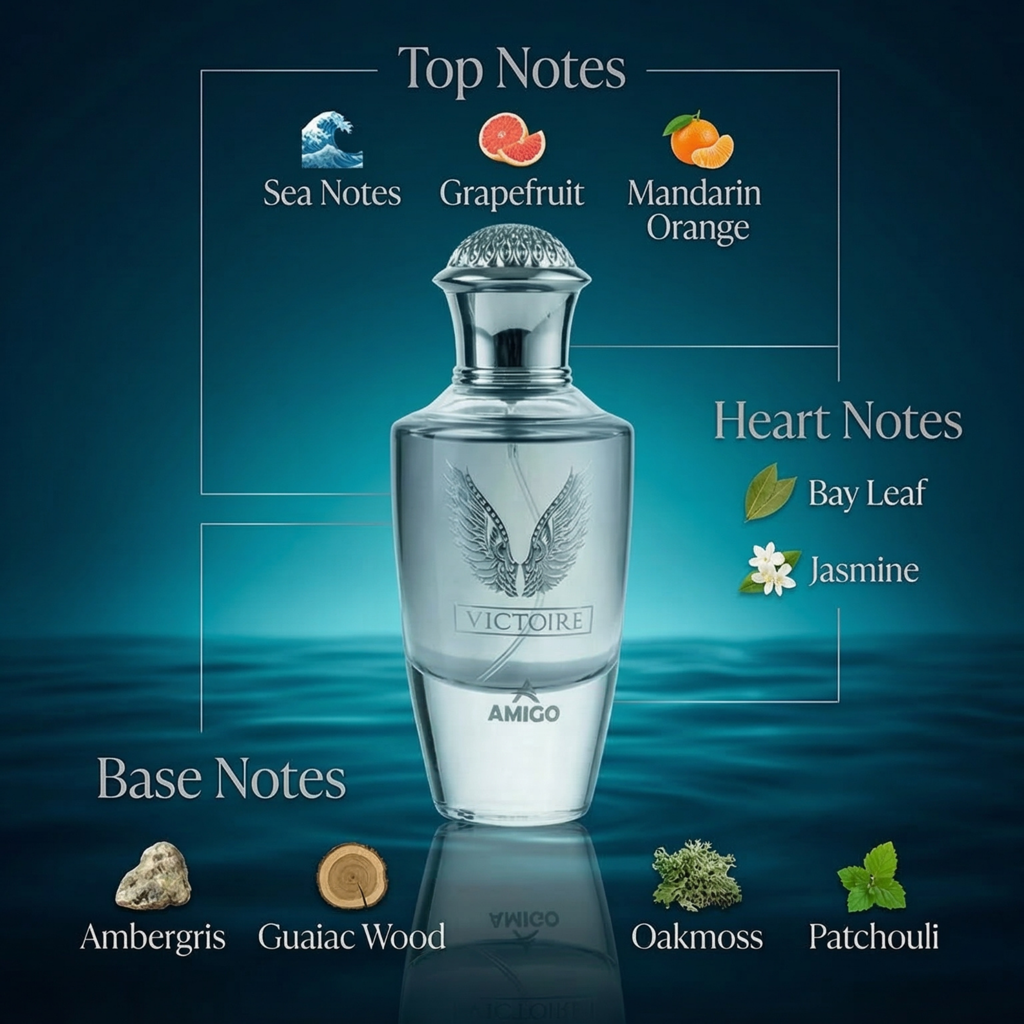 AMIGO VICTOIRE هو عطر رجالي منعش مائي يجمع بين الحيوية والقوة في تركيبة عصرية تناسب الرجل الطموح والواثق. رائحة نظيفة، منعشة وحلوة بلمسة ذكورية واضحة تمنحك حضورًا نشيطًا وجذابًا من أول رشة وحتى نهاية اليوم.